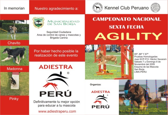 En esta oportunidad nos tocó ser los organizadores de la Sexta fecha del Campeonato Nacional de Agility 2009 y contamos con el juzgamiento del Juez KCP-FCI Héctor Savaraín y el apoyo del Municipio de San Borja a través de Seguridad Ciudadana y sus respectivas áreas de Brigada Canina y Control de canes y mascotas a quienes agradecemos el permiso otorgado y su cooperación para llevar a cabo el evento. Asimismo agradecemos a los representantes de Aula Canina por la oportuna ayuda que permitió mejorar la calidad del evento. Muchas gracias Mercedes Sánchez por aceptar juzgar la categoría Iniciante y a Sergio Carranza por el apoyo brindado durante el evento. También quiero agradecer a todos los participantes de nuestra escuela por el apoyo.