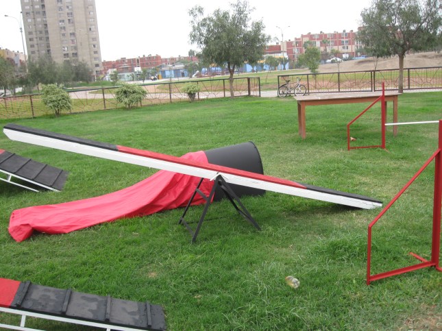 Hago un parentesis para manifestar que anteriormente tuve un vínculo de ayuda mutua con el Area de Control de Canes y Mascotas y la Brigada Canina el cual consistía en brindarles asesoría con respecto a la educación canina de los perros de seguridad y de los canes encontrados en las calles para su posterior inserción en una familia responsable que los adopten -esta última actividad fue la que mayor satisfacciones personales me ha brindado- a cambio ellos me daban el espacio para entrenar a las mascotas de mi Escuela en agility. Todo ese tiempo invertido ha hecho que tenga un grato recuerdo y que hasta la fecha goce de muy buenas relaciones con los amigos que tengo dentro del personal del Area de Control de Canes y Mascotas y la Brigada Canina, a quienes les tengo admiración por la labor que realizan en pro de la salud de las mascotas y de la adopción de perros abandonados en la calle muchas veces sin tener el apoyo oportuno de su propia institución municipal sino de colaboradores que en muchas oportunidades son vecinos amantes de las mascotas que viven en el distrito y de distritos periféricos como es mi caso que vivo en San Isidro. Todo esto me consta porque he vivido muchas veces el estrés de la presión de no tener recursos y crear soluciones muchas veces presionando al municipio por algo justo y crear conciencia en cuanto a la sobrepoblacion canina y la tenencia responsable de mascotas. Además de tantas anécdotas compartidas y vivencias hasta el 2009 hicieron que se fortaleciera un fuerte vinculo de afecto hacia el personal que por oportunidades que se presentan en la vida tuve que dejar para mudar mi centro de entrenamiento a un local alquilado. Bueno me desvié un poco del tema pero siempre es bueno que en estas líneas sepan del sentimiento de amistad que les guardo. Conocedor entonces que los principales beneficiados finalmente serían mis amigos, les di a esta empresa representante de Purina un contrato para prestación de servicios que no iban a poder rechazar de ninguna manera porque simplemente no iban a encontrar en otro lado propuesta mas conveniente para habilitar este juego de obstáculos por la modica suma de 830 dolares los cuales cubrieron los costos de los materiales, mano de obra del maestro y transporte y un mínimo margen de 10% por si acaso… margen que quedó pequeño porque me hicieron darle otra mano de pintura totalmente innecesaria pero al cual accedi para tenerlos a gusto.