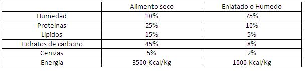En general ambos tipos de alimentos son equilibrados y completos. Su gran diferencia es su valor nutritivo en función del peso debido al diferente contenido en agua. Los húmedos suelen ser mas sabrosos que los secos. Resultan siempre muy caros en comparación con los alimentos secos y debido a su coste quedan relegados a perros de razas pequeñas o a gatos. Para poder comparar nutricionalmente estos distintos tipos de alimentos debemos hacerlo con la materia seca, que es la resultante de restar el porcentaje de humedad, así en 100 gramos de alimento seco tendremos unos 90 gramos de materia seca mientras en los mismos 100 gramos de un producto enlatado dispondremos de solo 25 gramos de sustancia seca.