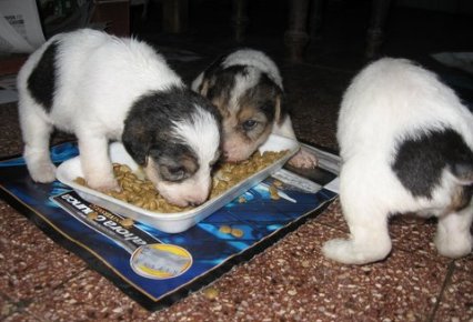 Como sus necesidades de calorías son elevadas, el cachorro debe recibir varias comidas diarias. Entre las 7 y 12 semanas, hay que alimentarlo cuatro veces al día: por la mañana y por la noche con una comida a base de leche y cereales para perros, y al mediodía y por la tarde, con una comida que contenga cereales, verduras y carne fresca picada mezclada con hueso en polvo. Los alimentos industriales especiales para cachorros son muy aconsejables, pues son equilibrados y responden a las necesidades específicas del cachorro.